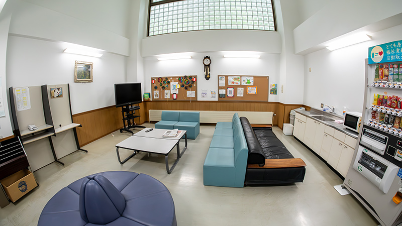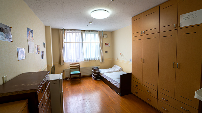 寮は個室。一人ひとりのプライバシーを尊重し、16~17㎡(10~11畳)の広い部屋でゆっくり過ごせます。部屋には、ナースコール、インターネット環境、クーラー、洗面台、タンス、ベッドが備え付けられており、他にもカラオケ、ピアノ、卓球台、調理実習等、余暇支援の設備が充実しています。