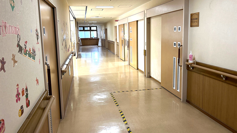 施設の廊下は広く、車椅子2台がすれ違えるように設計、緊急時の対応に備え、エレベーターはストレッチャーが入る広さです。