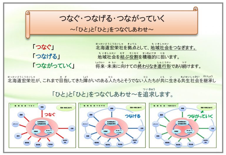 北海道宏栄社が、これまで目指してきた障がいのある人たちとそうでない人たちが共に生きる共生社会を継承し「ひと」と「ひと」をつなぐしあわせを追求します。
